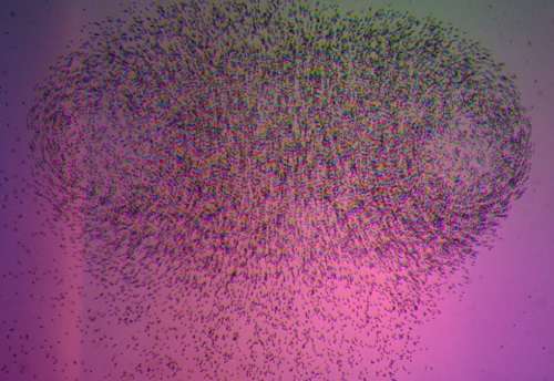 The smartphone PIV system consists of four 41-megapixel smartphone cameras positioned at different angles around the flow volume—in this case a glass tank filled with moving water and polystyrene tracer particles forming a vortex ring flow. To overcome the low sensitivity of the phone cameras, the cameras were set up to photograph the shadows of the tracer particles cast by blue, green and red LED lights, imprinting in the same image all three colors (see image). The results compare well with those obtained using a commercial tomographic PIV system, with deviations in circulation flow of less than 8 percent.