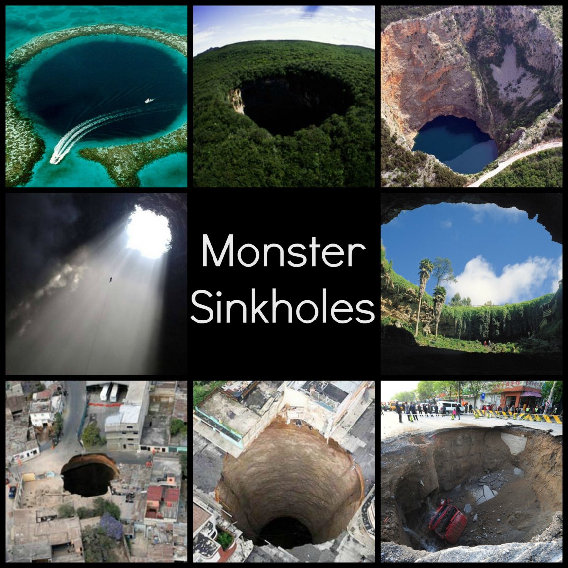 Sinkholes: These terrifying monsters are massive holes that open up in the Earth without warning. They can be as small as a car, or they can span hundreds of acres. Some dip just a few meters into the earth, while others are over 600 meters (2,000 feet) deep. These beasts have swallowed people, cars, trees, and even entire houses or city blocks. Sinkholes are terrifying; they are unstoppable; they are deadly; and they are almost entirely unpredictable. Sinkholes (also aptly known as “sinks”) owe much of their creation to water.