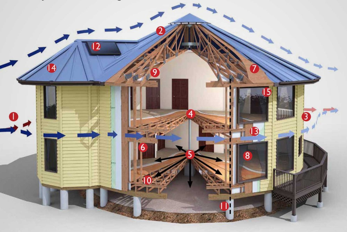 Deltec’s model house is entirely circular, transferring wind forces around the structure instead of concentrating them on one side. The internal trusses holding up the floors radiate outwards from the center of the building like spokes on a wheel, further reinforcing the structure. Machine-treated framing lumber used in Deltec’s hurricane homes can bear 2,400 pounds per square inch, making it twice as durable as typical framing material.