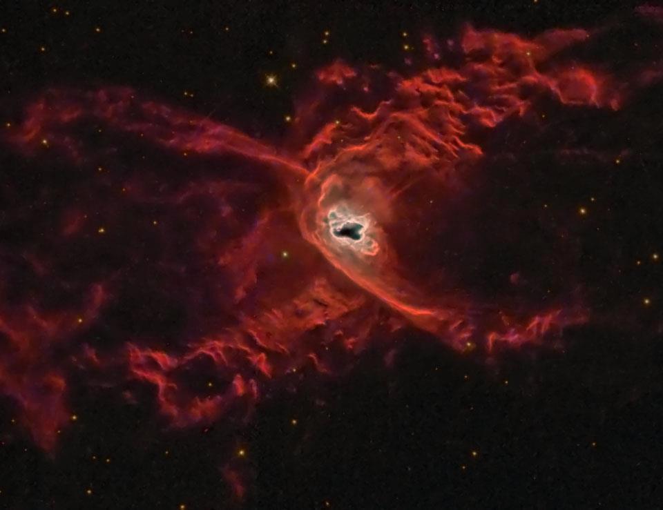As mentioned previously, NGC 6537 (The Red Spider Planetary Nebula’s formal designation) is a planetary nebula, but it’s also bi-polar (two-lobed), which essentially means that it exhibits a bipolar structure, composed of materials flowing from the center of the nebula. In this instance, at the center lies two white dwarfs, where internal winds are known to blow material out into space at approximately 621 miles (1,000 kilometers) per second.