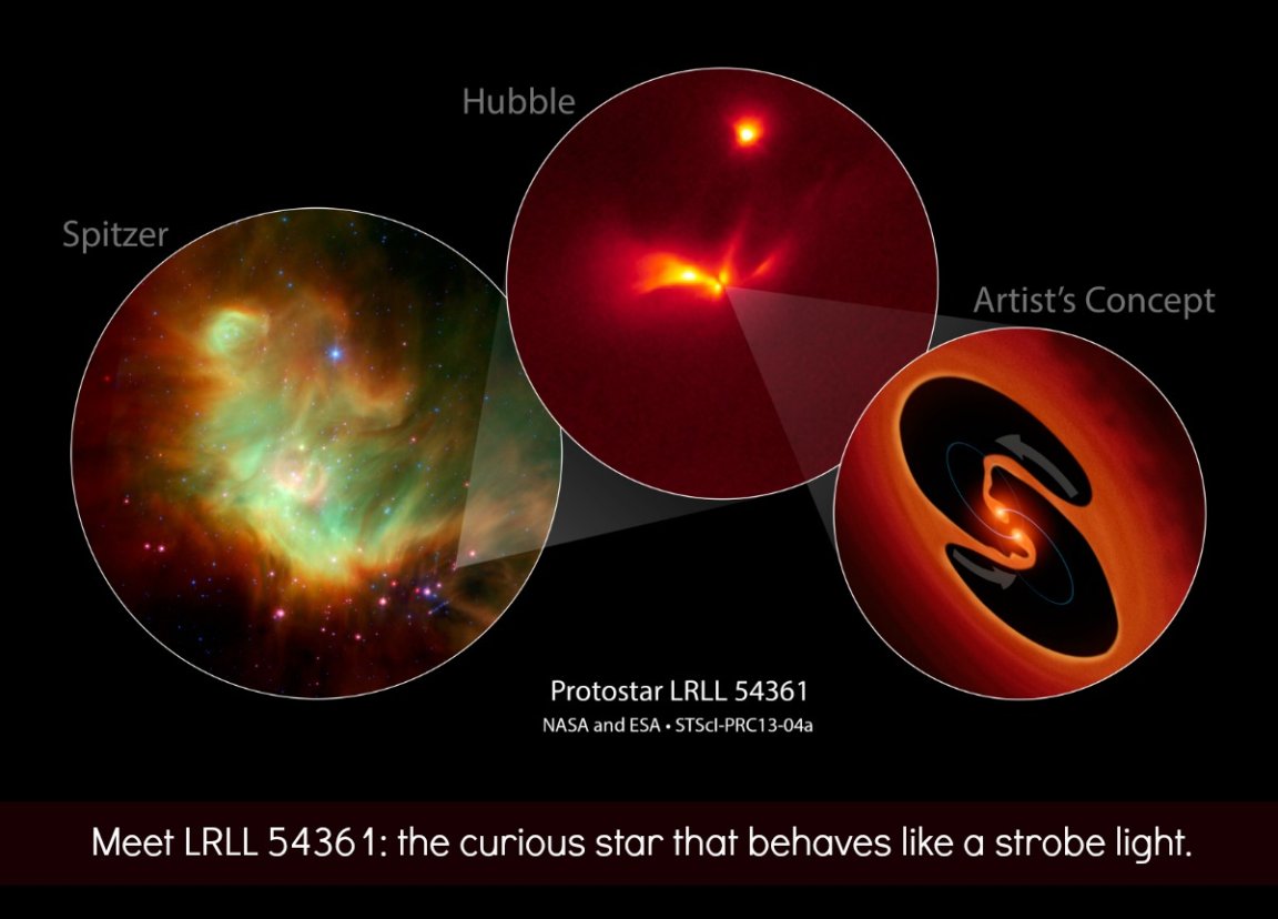 To get a complete picture of the on-going activity, several different telescopes have been pointed in the general vicinity of the party animal. This image is a collage showing two real images of LRLL 54361. In the first (on the far left), we have a false-color, infrared-light image of LRLL 54361, which was captured by the Spitzer Space Telescope. In the second (center) image, we see a monochromatic-colored image of the region, taken by the Hubble Space Telescope’s keen eye. This one is highly effective in helping us resolve the detailed structure of the protostar, like the cavities (shaped by fierce stellar winds),where light runs throughout the dusty disk.