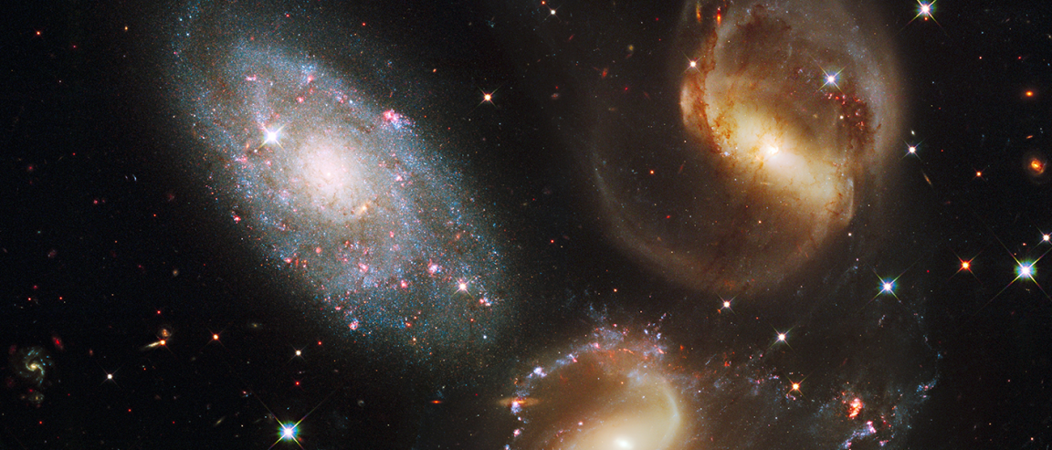 Essentially, the mass of a cluster of galaxies known as Abell 370 is so great, it warps space in such a way that the light from galaxies behind it is magnified and distorted. When Hubble then views that area of the sky, it not only sees the original galaxy cluster, it also picks up on the light from the galaxies far beyond it. In fact, one of the galaxies displayed in this new image is actually 13 billion light-years away, and it appears to be in multiple places at once in the photo.