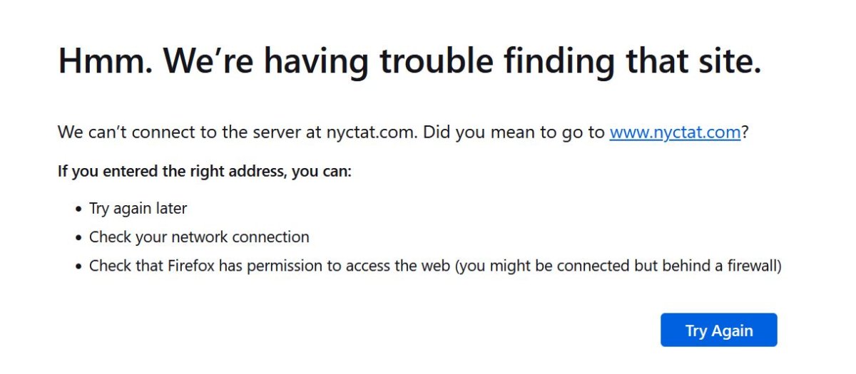 Oh, and the broken website? Briggs said that it works if you add a “www” before “nyctat.com” — though when was the last time you did that? — and the website does work on some browsers without the “www.” It still doesn’t load on Firefox.