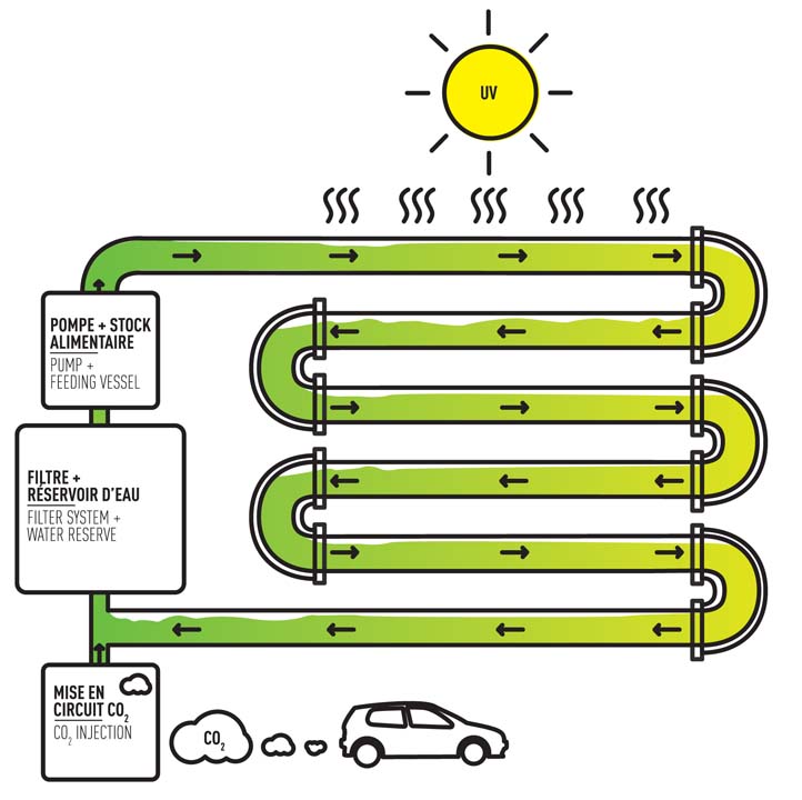 Notably, the system is quite straightforward and easy to replicate. The algae is cultivated inside tubes, and the system only requires a simple series of pumps, filters , and solar panels in order to function. Moreover, once the algae matures, they can be utilized in a number of different products (including the previously mentioned biofuel, as well as nutrients, medication, etc.).