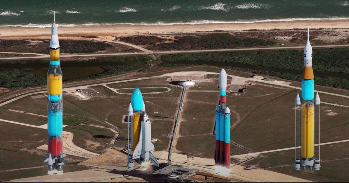 Due to the extremely low density of LH2, NASA’s SLS would need a gigantic fuel tank. To mitigate that, designers gave the rocket two boosters on either side, a design derivative of NASA’s retired Space Shuttle.