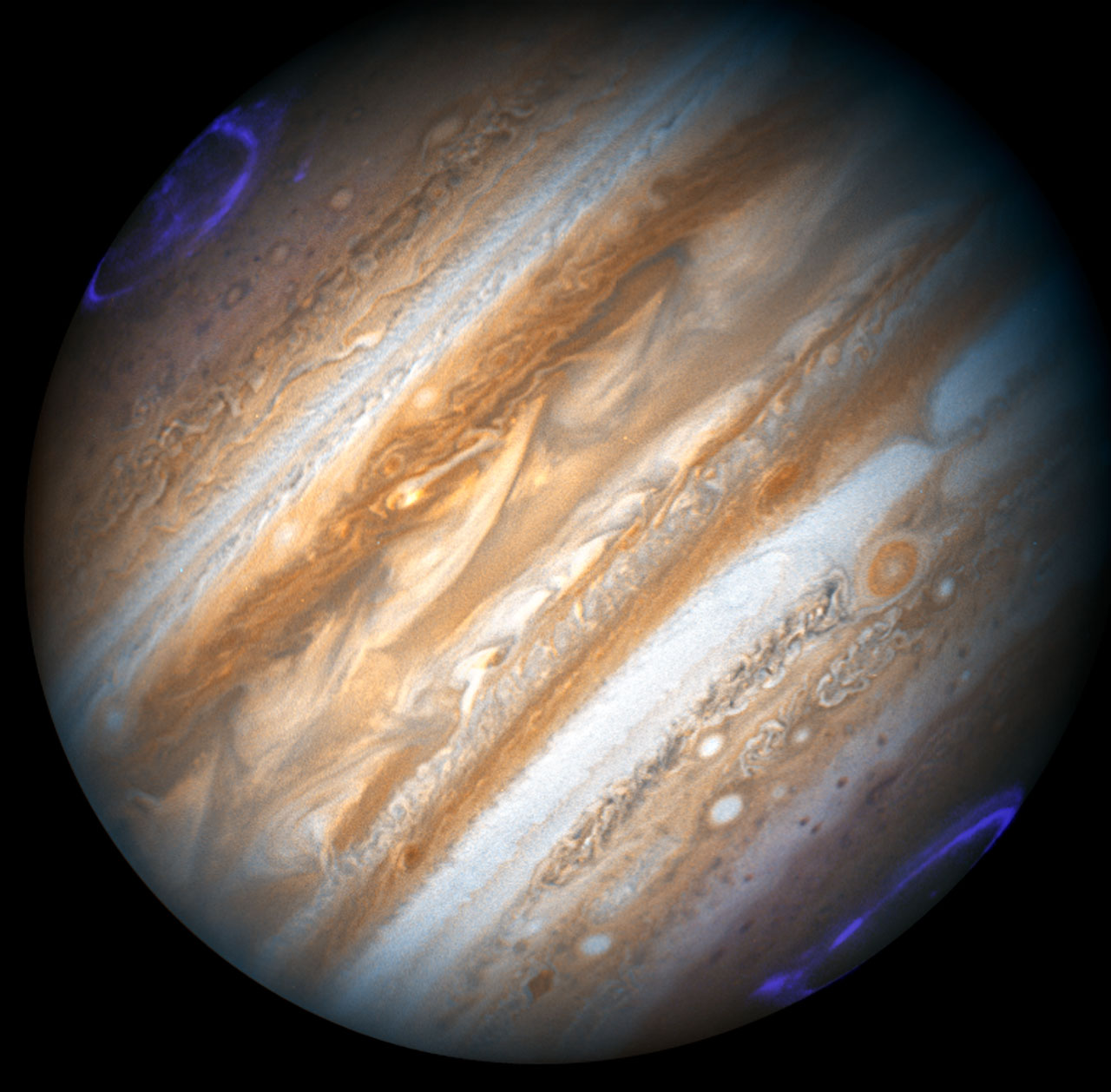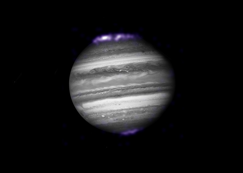 In this composite image, we get a glimpse of auroras that are a thousand times more powerful than Earth’s. The purpose of the Chandra collaboration was precisely to study these powerful X-ray auroras, which can clearly be seen flashing in violet near the poles of the planet.