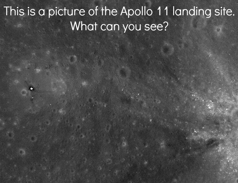 This is a picture of the Apollo 11 landing site taken by the Lunar Reconnaissance Orbiter (LRO). The LRO’s primary mission is to make a 3-D map of the lunar surface. In the process, the probe has caught some of the first images of the Apollo equipment left behind by the astronauts who walked the surface of the moon more than 40 years ago (just another debunking for the anti-moon landing folks).