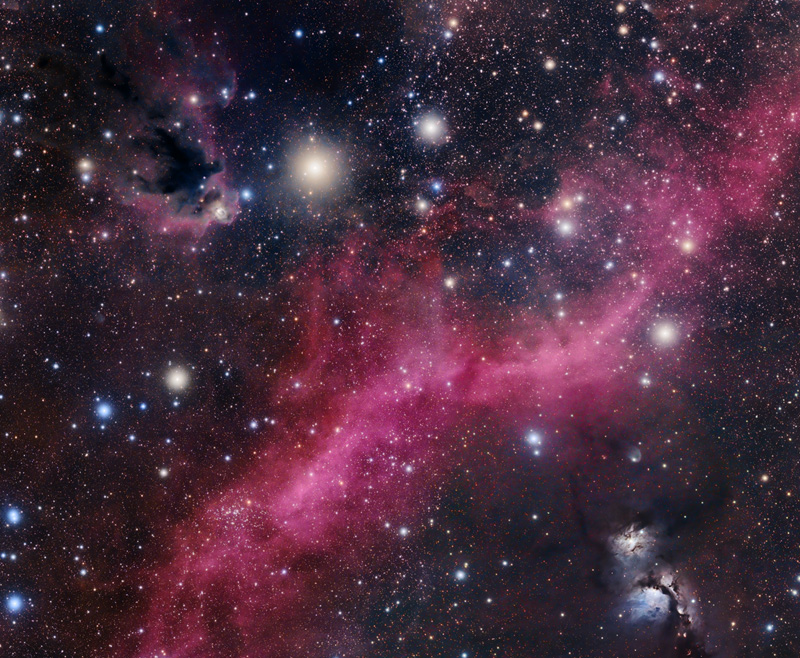 Like all reflection nebulae, this region is powered by stars surrounded by lots of gas and dust. The dust is so dense in some parts that light simply can’t break through, but in regions where dust is more scarce, when light from embedded stars leaves the surface, it is greeted by a wall of dust, which sends light scattering at the blue end of the electromagnetic spectrum.