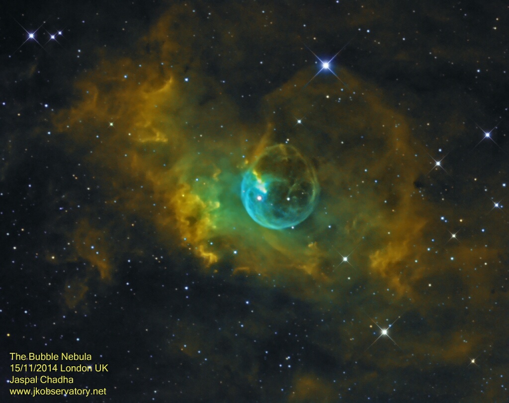 This image of the Bubble Nebula was taken by Jaspal Chadha (from JK Observatory), using an Altair Astro RC 250TT Scope, QSI 690 CCD and Ioptron CEM 60. You can see more of his astrophotography work on flickr.