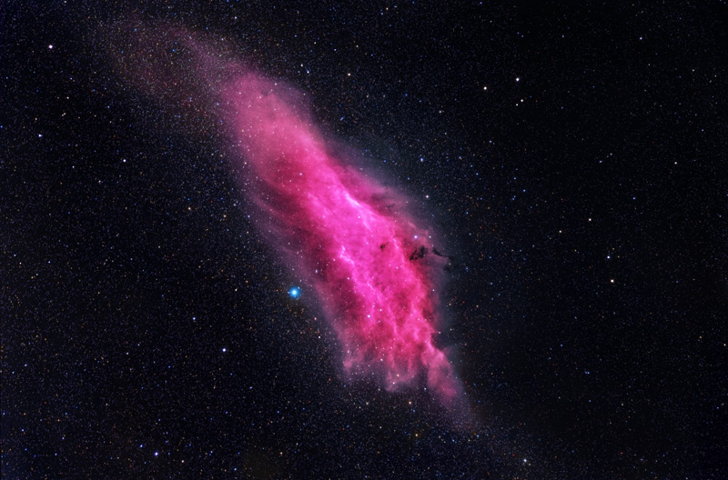 By definition, this cloud is counted among the ranks of emission nebulae (they form as a result of star formation). As hot young stars come to fruition, they energetically release large quantities of ultraviolet radiation, which shape and sculpt gas and dust, whilst ionizing the gas, and making it glow. One particular high-mass star may be the driving force behind the California Nebula. Called Xi Persei, it hangs out on the outer edge of the nebula.