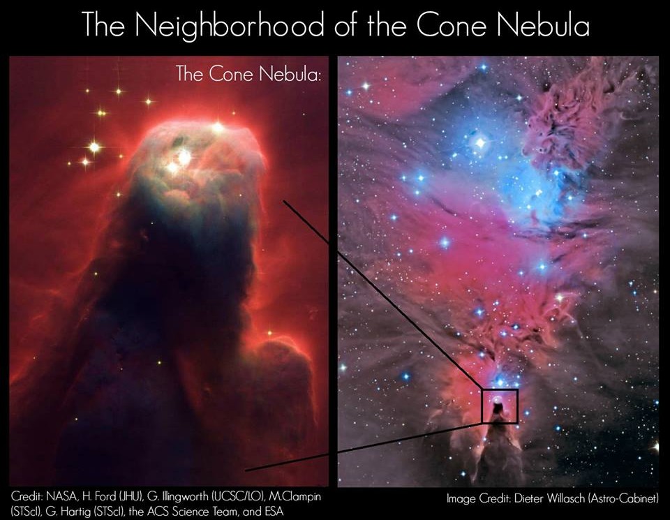 Here, we take a good look at the space in the general vicinity of the Cone nebula, which is a star forming region located more than 2,500 light-years from Earth in the constellation of Monoceros (it also looks like a massive space beast, doesn’t it?).