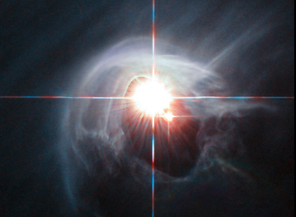 Two stars shine through the center of a ring of cascading dust in this image taken by the NASA/ESA Hubble Space Telescope. The star system is named DI Cha, and while only two stars are apparent, it is actually a quadruple system containing two sets of binary stars.