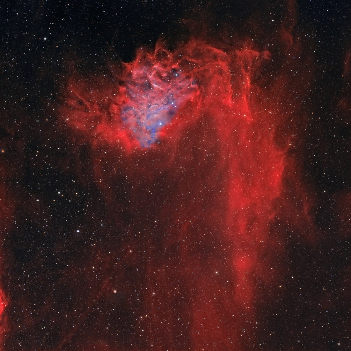 The dark dust filaments help highlight the contrasting shades of black, red and blue. The other two colors are the result of ionization within the gaseous regions surrounding AE Aurigae. Ultraviolet radiation streaming from the turbo-charged star strip electrons from their atoms. When the atoms eventually recapture their lost electrons, they generate a fantastic glow. In the case of the blueish section seen in better detail above, particles bounce around after coming in contact with tiny grains of interstellar dust. The subsequent scattering generates what we call a reflection nebula.