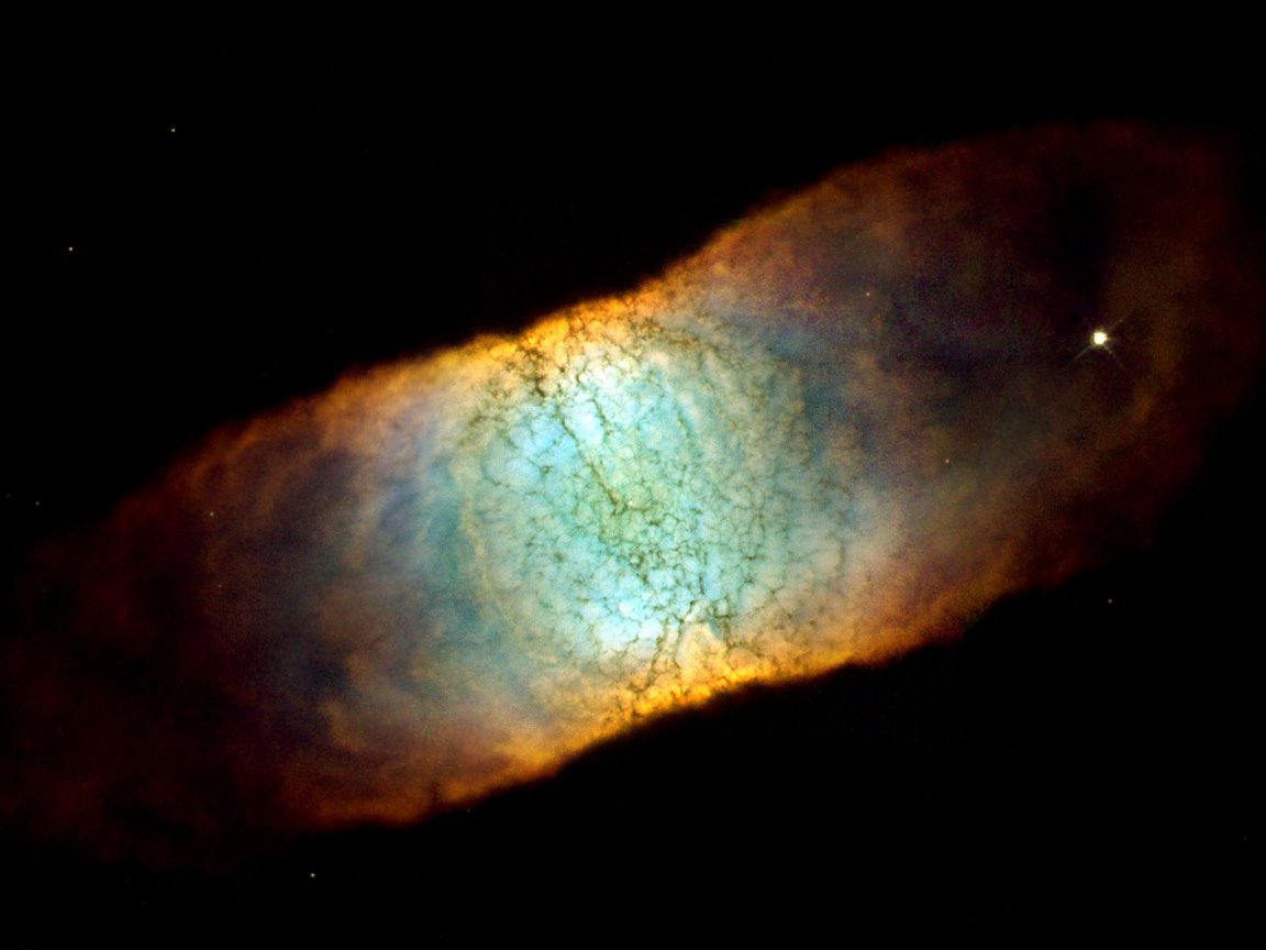 This image is a composite put together using images taken between 2001 and 2002 by Hubble. Each dataset puts different sections of the nebula on display, including the hot, energetic outflows of gas spilling out of both ends of its bipolar structure, along with the cosmic-equivalent of smog (interstellar dust) that gives the nebula — especially the central region — the appearance of cracked paint. You can’t, however, see the proteginer star (normally found in the center) in this particular image.