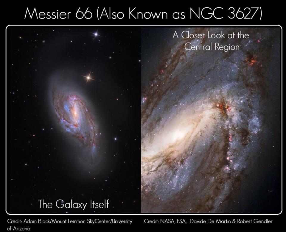 This absolutely picturesque galaxy is Messier 66 (also known as NGC 3627), an intermediate spiral galaxy found more than 36 million light-years from Earth (in the constellation of Leo). The galaxy itself is a member of the famous Leo Triplet (or the M66 group); a region of space that contains several small galaxies. (The galaxy we’re looking at here is the largest of the bunch, coming in with a diameter of about 100,000 light-years — roughly equivalent to the size of the Milky Way) Among them, we also have both Messier 65 and NGC 3628.