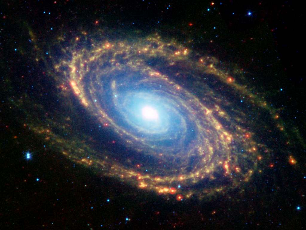This particular image of Messier 81 was captured a long time ago using two instruments—the Infrared Array Camera (IRAC) and the Multiband Imaging Photometer (MIPS)—on the Spitzer Space Telescope (in fact, this was one of the very first images taken by Spitzer); It reveals details of the galaxy at near-infrared wavelengths. Places of green may be composed of polycyclic aromatic hydrocarbons, whilst red is representative of heated dust. Blue comes from “stellar emission observed at 3.6 μm.” (See a larger image here)