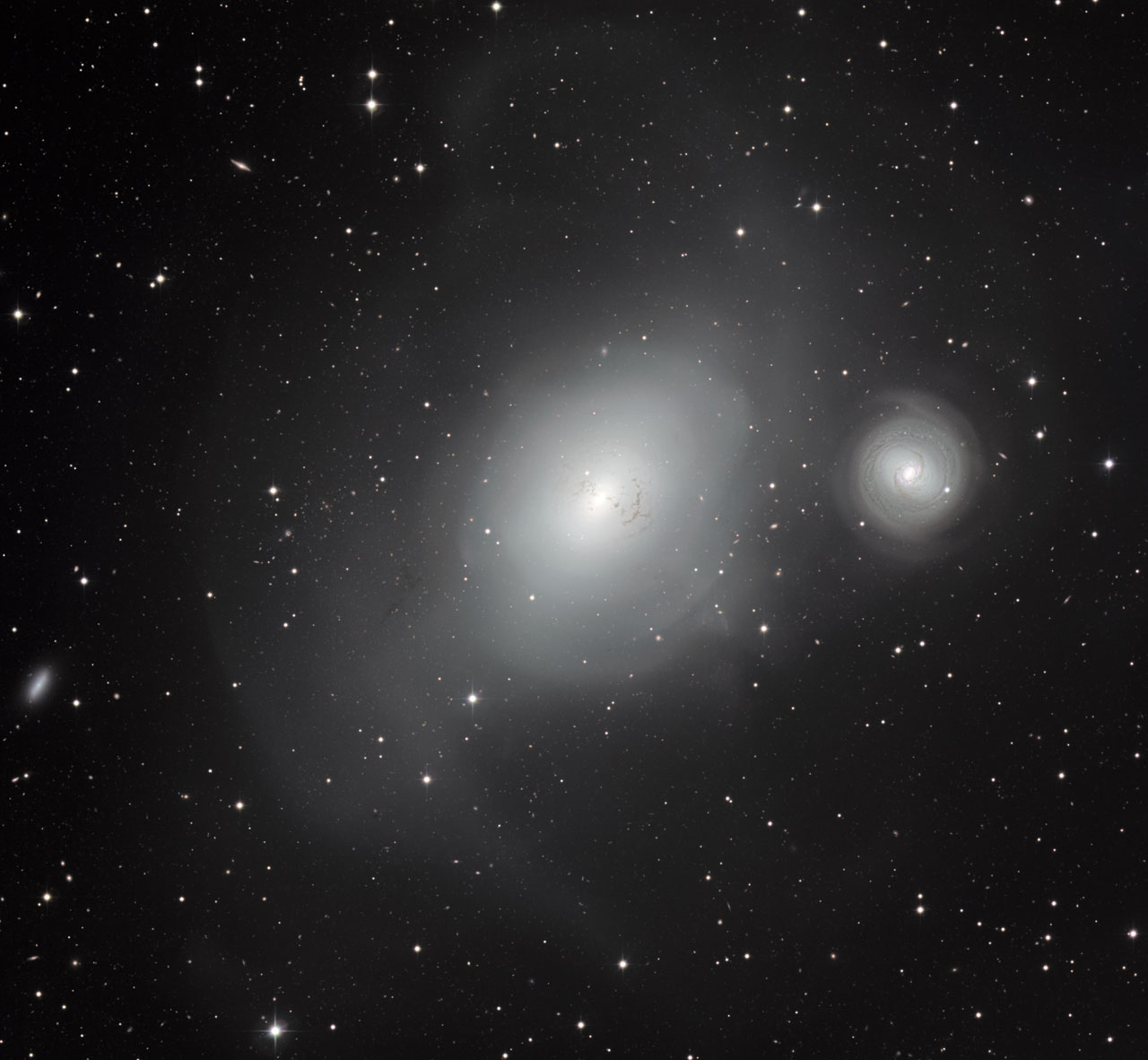 Lurking somewhere in this image is a cleverly disguised “serial killer”. A cosmic cannibal of sorts, the large fuzzy disk is a galaxy known as NGC 1316 (aka Fornax A). Off to the right a bit we see the smaller, unassuming spiral galaxy NGC 1317. Despite living in the same galactic neighborhood, these two galaxies have led extremely different lives: NGC 1317 a quiet ordinary life and NGC 1316 covered in battle scars indicative of a violent past.
