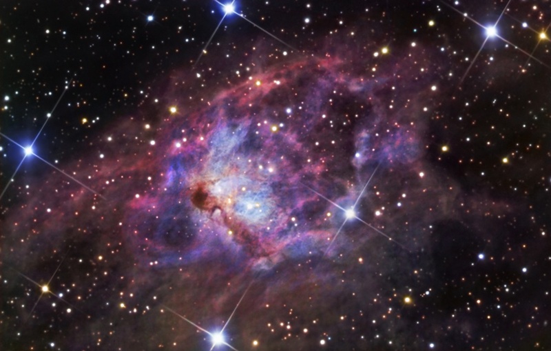 Sometimes referred to as the Fox-face nebula, this region is peculiar in many ways. The primary reflection nebula (seen in the center in bluish-white) is surrounded by a contrasting ring of ionized hydrogen. This ring is powered by immensely huge stars that are incredibly young, but invisible from this vantage point.