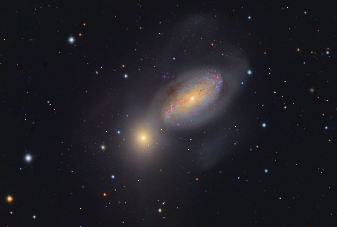 Still yet, its defining feature is its central core, which is designated as an active galactic nuclei (AGN). Some have hypothesized that NGC 3226 might be siphoning material from its companion, which would help kick-start the star formation activity pictured in the red and blue regions. These characteristics can be attributed to the gravitational perturbations both galaxies have experienced over the last few millions of years. Said encounters also provided the attraction needed to bring the two supermassive black holes lurking in the central portion of both galaxies together. Now, the core is of NGC 3227 is a heavy source of x-ray emissions.