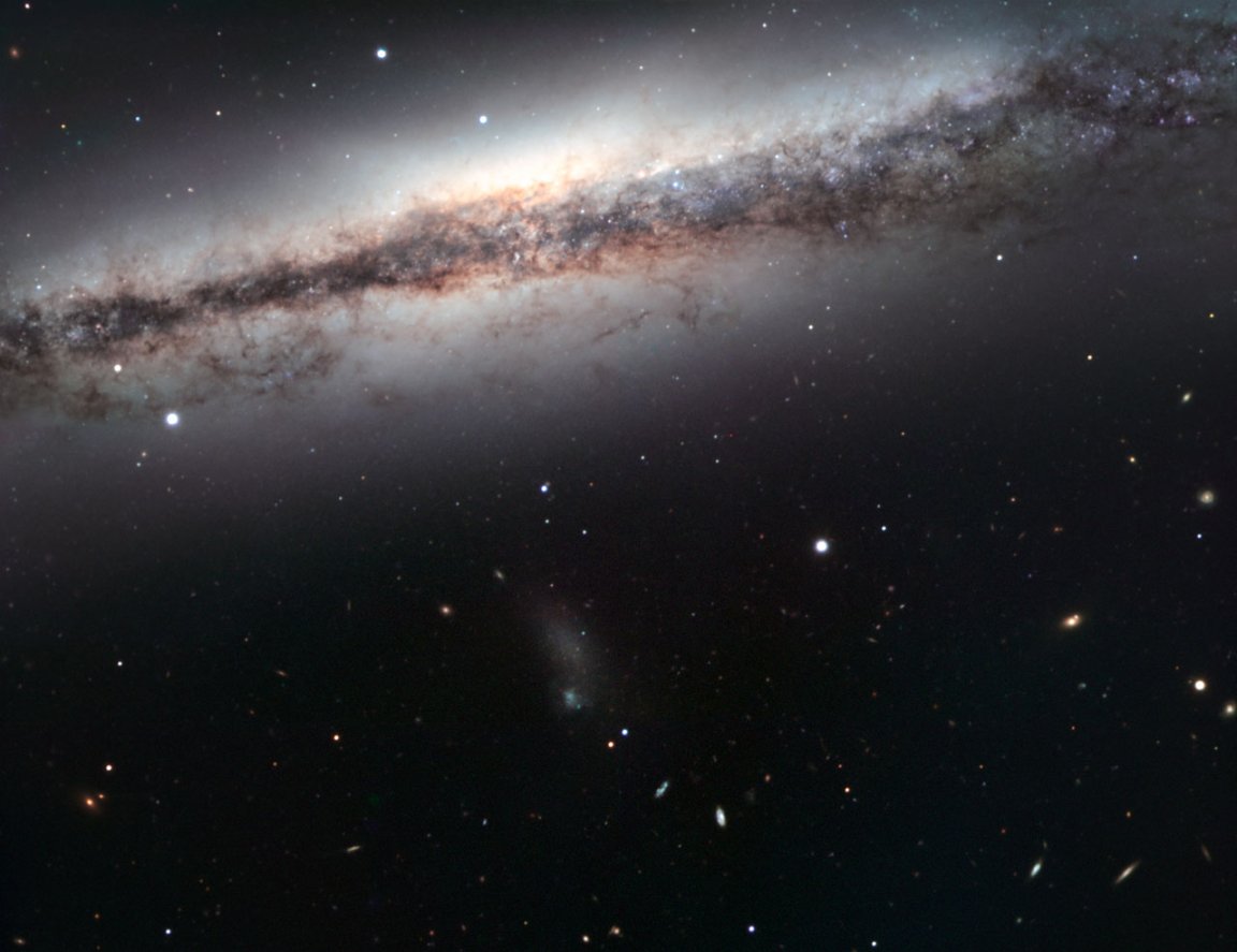 The depth of the image reveals a myriad of galaxies of different shapes and colours, some of which lie much further away than NGC 3628. Particularly noticeable is the fuzzy blob just in the centre of the image, which is a diffuse satellite galaxy. A number of globular clusters can be seen as fuzzy reddish spots in the halo of the galaxy. Also visible as bright spots near the lower edge of the image (the two blue star-like objects below the satellite galaxy) are two quasars, the central engines of distant and very energetic galaxies, billions of light-years away.