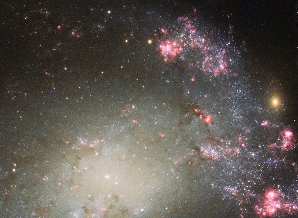 When something of this nature occurs, star-formation activity happens on a much larger scale, appearing in the form of bright blue and pinkish-red patches entangled in gas and dust-filled spiral arms
