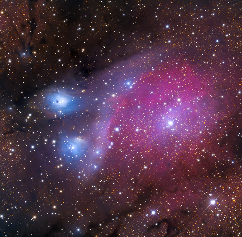 In addition to the cluster and the reflection nebulae, another object is in view: a huge, semi-transparent cloud of gas to which the nebulae connect, resembling a cosmic percentage symbol. This cloud, dubbed IC 1283 (smaller clouds, IC 1284 and IC 4700, are embedded), is comprised of mostly of hydrogen, with bits of dust thrown in for good measure. A source of ultraviolet radiation has ionized this cloud, but it may not in fact be associated with the other three objects.