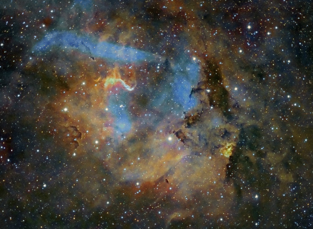 SH2-132’s appears to belong to the Cepheus OB1 association, which also boasts one of the largest known stars in existence: an orange hypergiant known as RW Cephei. It may not, however. There’s a chance they are merely in the same field of view.