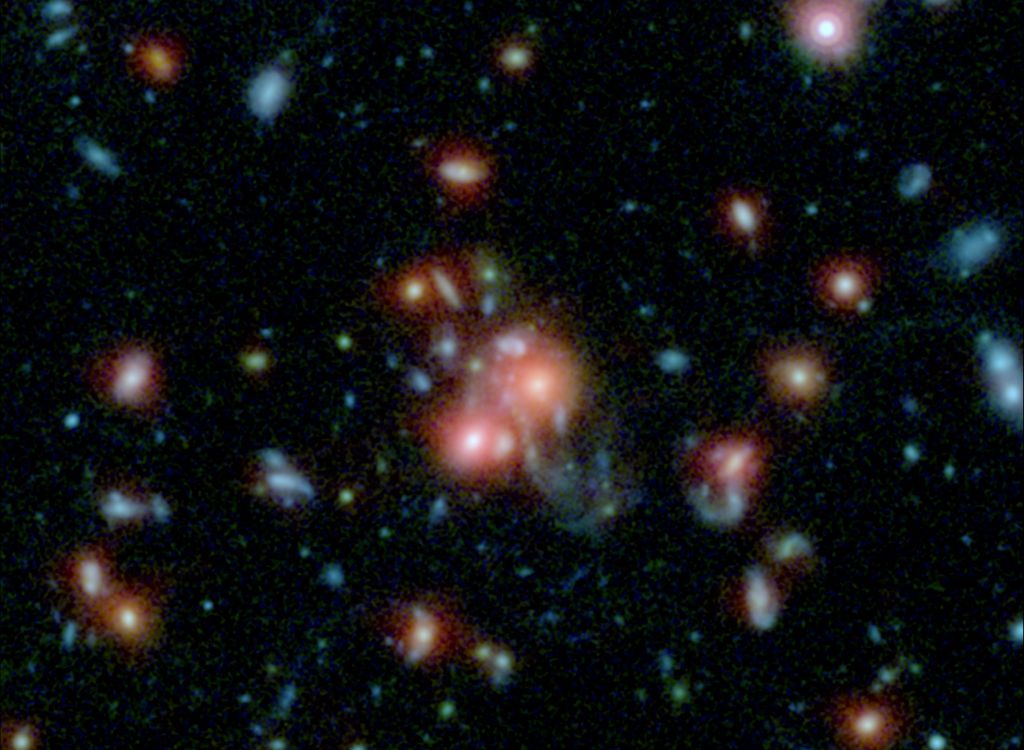 A large cluster of high-mass galaxies, collectively known as SpARCS 1049+56, can be seen in a new image from NASA. Captured using the firepower of Hubble and Spitzer, this multi-wavelength composite paints the cluster’s features in optical and infrared light.