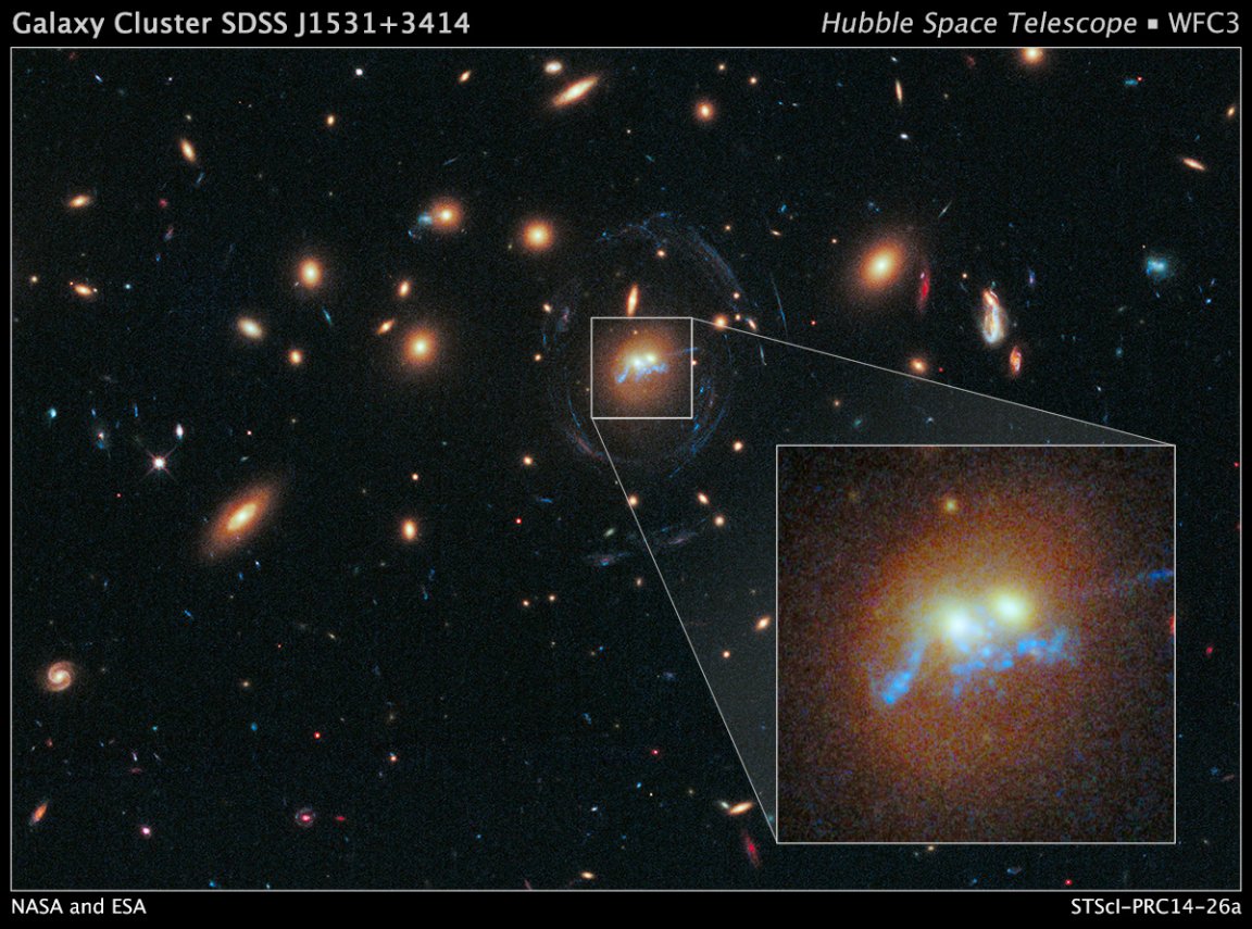 This newly-released Hubble image shows two galaxies from a distant cluster, dubbed SDSS J1531+3414, that are staring into the eye of a massive storm. You see, these galaxies are already in the initial stages of a merger. For now, they remain separate, but in the coming years, gravity will eventually draw both of them together until they become one galaxy, losing their separate identities forever