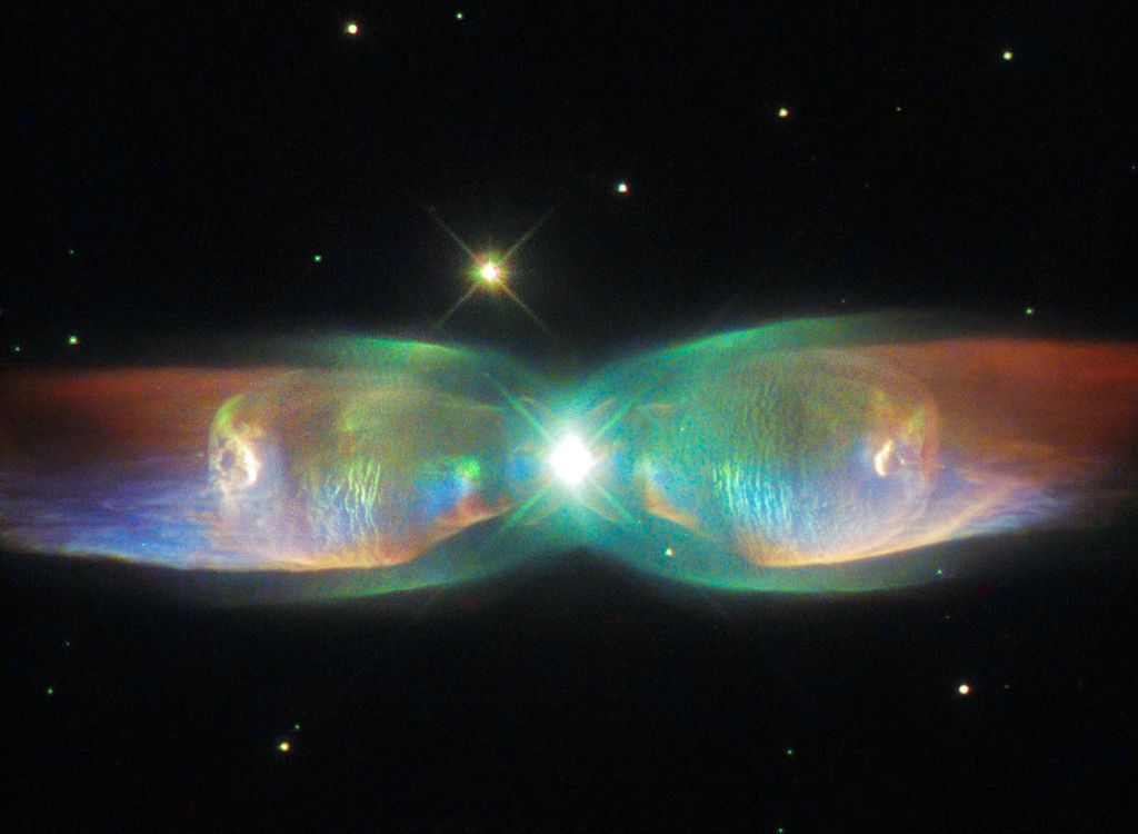 In a new image from the Hubble Space Telescope, the structure of the Twin Jet Nebula is expressed in unprecedented resolution. The colors are also stunningly vivid, helping highlight the nebula’s key features—especially the intricate shells, and the knots of gas that continue to expand outward from the source (or sources, rather): one dying star, and a dense body called a white dwarf. Though small, the dwarf star remains incredibly hot and energetic, which provides the nebula with the proverbial match it needs to ignite.