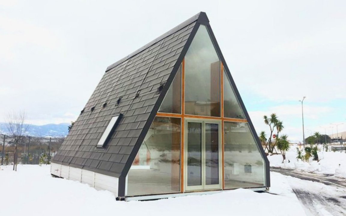 Known as the M.A.Di home, this A-shaped house can be folded down completely flat, making it easy and economical to ship. Additionally, these homes are built specifically to withstand earthquakes using cross-laminated timber, or CLT.