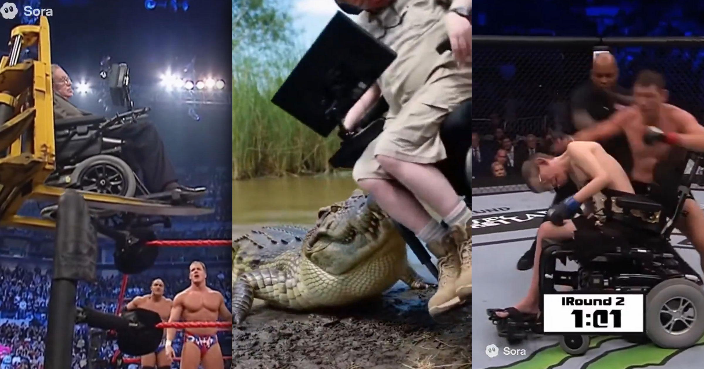 In another video, Hawking takes blow after blow to the face from a UFC fighter. “Hawking’s in trouble,” the announcer yells, as the physicist topples out of his wheelchair.