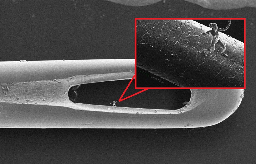 Artist Jonty Hurwitz has created the world’s smallest sculptures: nanosculptures, created using a 3D printed photosensitive material, so small they can fit on the head of an ant, in the eye of a needle, on a human hair — so small they look like no more than a mote of dust hanging in a ray of sunlight. The largest of his sculptures is about the width of a human hair; the smallest is less than half that width.