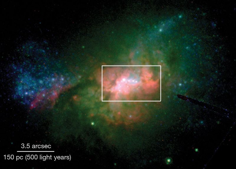 Henize 2-10 is a small irregular galaxy that is not too far away in astronomical terms—30 million light-years. “This is a dwarf starburst galaxy—a small galaxy with regions of very rapid star formation—about 10 percent of the size of our own Milky Way,” says co-author Ryan Hickox, an assistant professor in Dartmouth’s Department of Physics and Astronomy. “If you look at it, it’s a blob, but it surprisingly harbors a central black hole.”