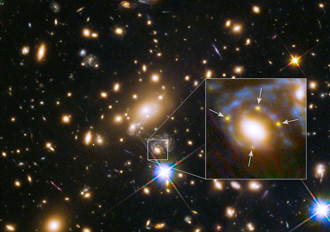 In a distant expanse of space, a star on the precipice of death has exploded. Only, this ancient star’s light encountered a large galaxy cluster on its journey to Earth, resulting in the gravitational lensing we mentioned above. Only instead of two copies, there are four.