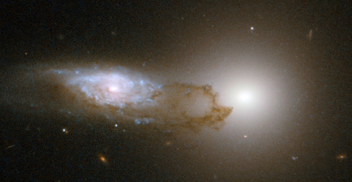 The starlight from the background galaxy is partially obscured by the bands and filaments of dust associated with the foreground spiral galaxy. The Hubble image unravels the fine detail in the patchy clumps of dust confined to the spiral arms of the spiral galaxy. This dust reddens the light from the background just as the intervening dust in the Earth’s atmosphere reddens sunsets here. AM1316-241 is located some 400 million light-years away toward the constellation of Hydra, the Water Snake.