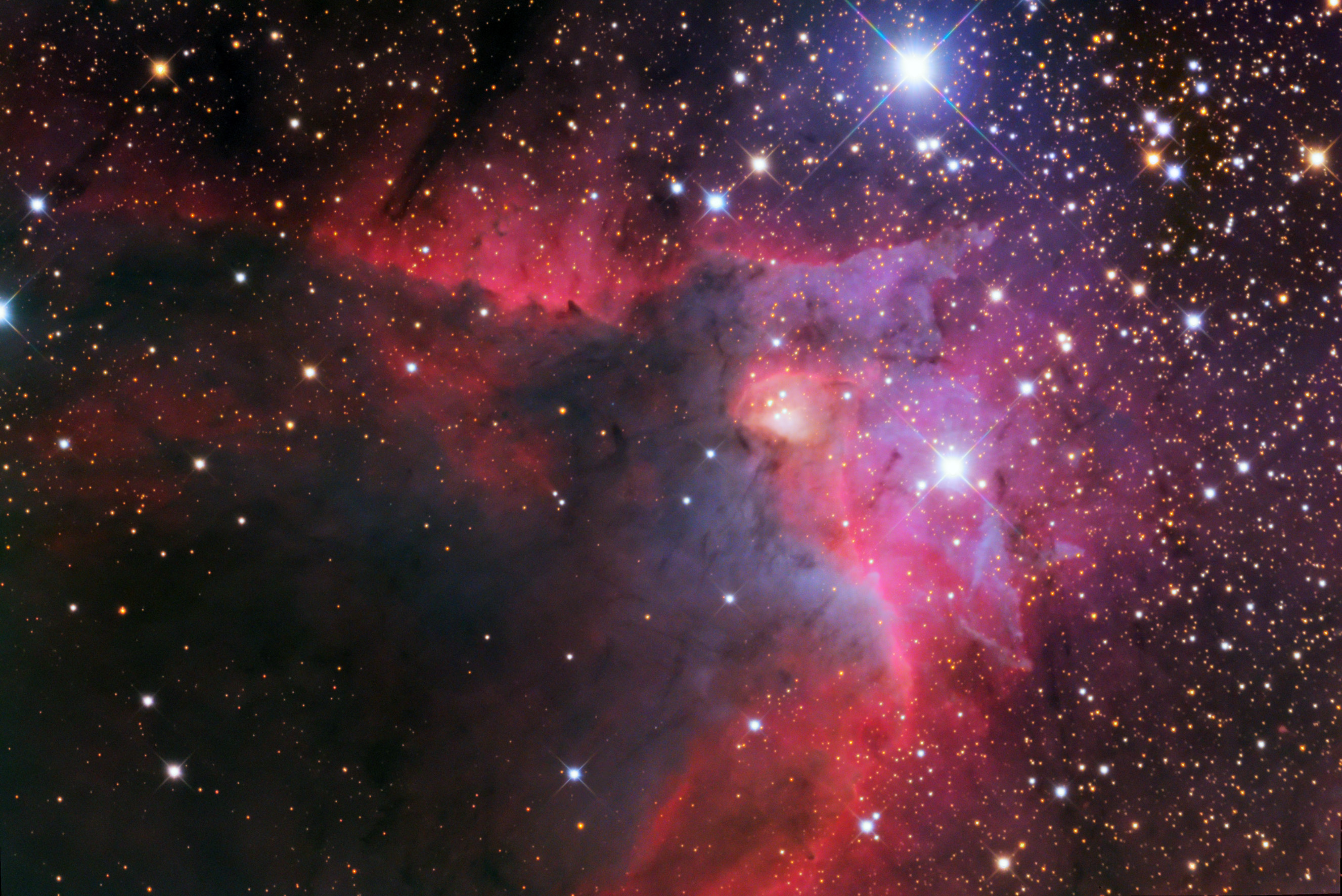 Secondly, we have star formation region that is shaped like a crescent. It is comprised of doubly ionized hydrogen molecules. Said ionization is caused by stars embedded in Cepheus B; a molecular cloud located on the outskirt of the region. Two in particular, dubbed HD 217061 and HD 217086, are responsible for the bulk of the work. Within this same region, we can see a reflection nebula, an emission nebula and a dark nebula. All of which are located about 2,400 light years away in the constellation of Cepheus.