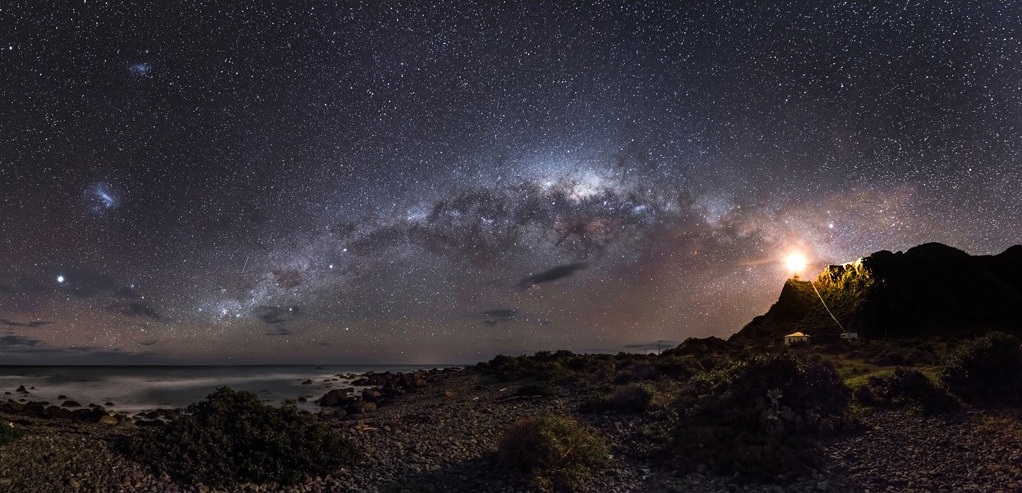 To the right of the picture, a lighthouse can be seen standing guard over the shoreline. The Milky Way stretches low across the Southern sky as their winter comes to an end. On the left side of the image, high in the sky, you can see the Large Magellanic Cloud (bottom) and the Small Magellanic Cloud (top) – both Galaxies are about 163,000 and 200,000 light-years away respectively. Both galaxies are small satellites of the Milky Way and they are some of the closest galaxies to the one we call home. I think (and let me stress *think*) the bright star on near the horizon to the left is actually Jupiter. Don’t quote me on that, unless it’s right, then quote away.