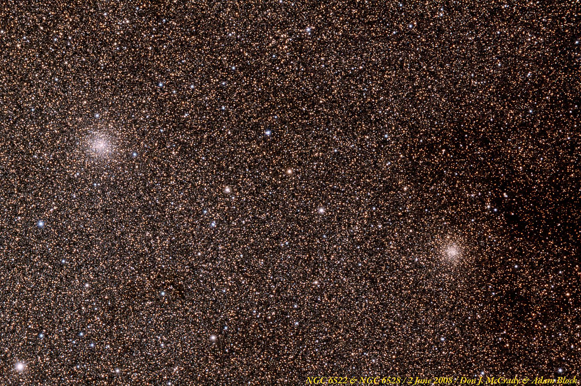 Have you ever heard of Baade’s Window? This is a region of sky with a particularly low density of interstellar dust as visible from Earth. Because of this low density, it provides a sort of window into the Milky Way’s galactic center, allowing scientists to study the core of our galaxy without normal interference from the interstellar dust that normally obscures our view. Baade’s window is about 1800 light-years from the heart of the Milky Way and can be found near Sagittarius. This region is also home to several globular clusters, most notably, NGCs 6522 and 6528. Baade’s window itself covers 1 degree of sky, or two full moons.
