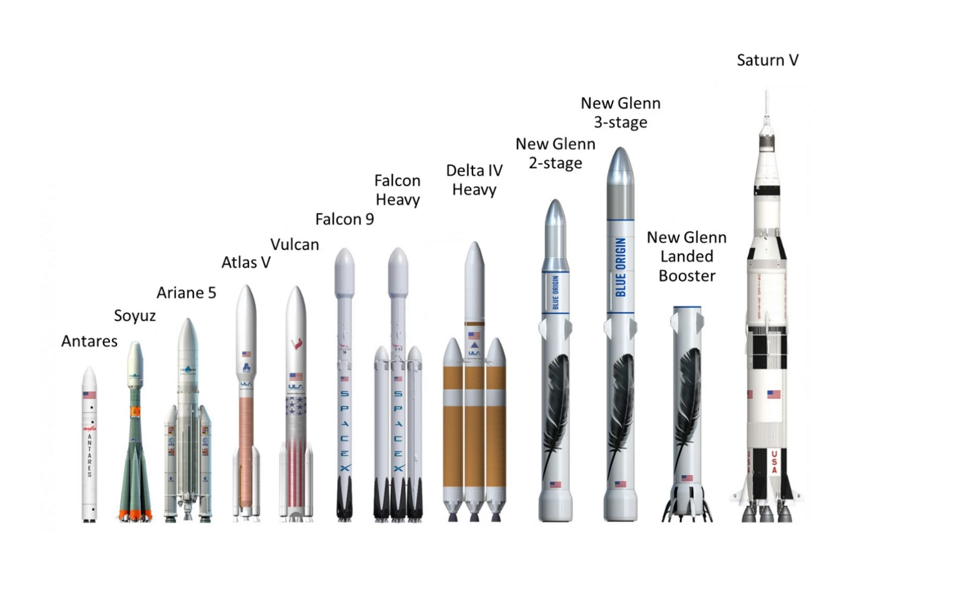 The New Glenn rockets have a two-stage and a three-stage variants, both powered by seven BE-4 engines. These rockets would have about 1.6 million kilograms (about 3.85 million pounds) of thrust at sea level. The three-stage variant is almost as tall as the Saturn V rocket that brought the Apollo astronauts to the moon.