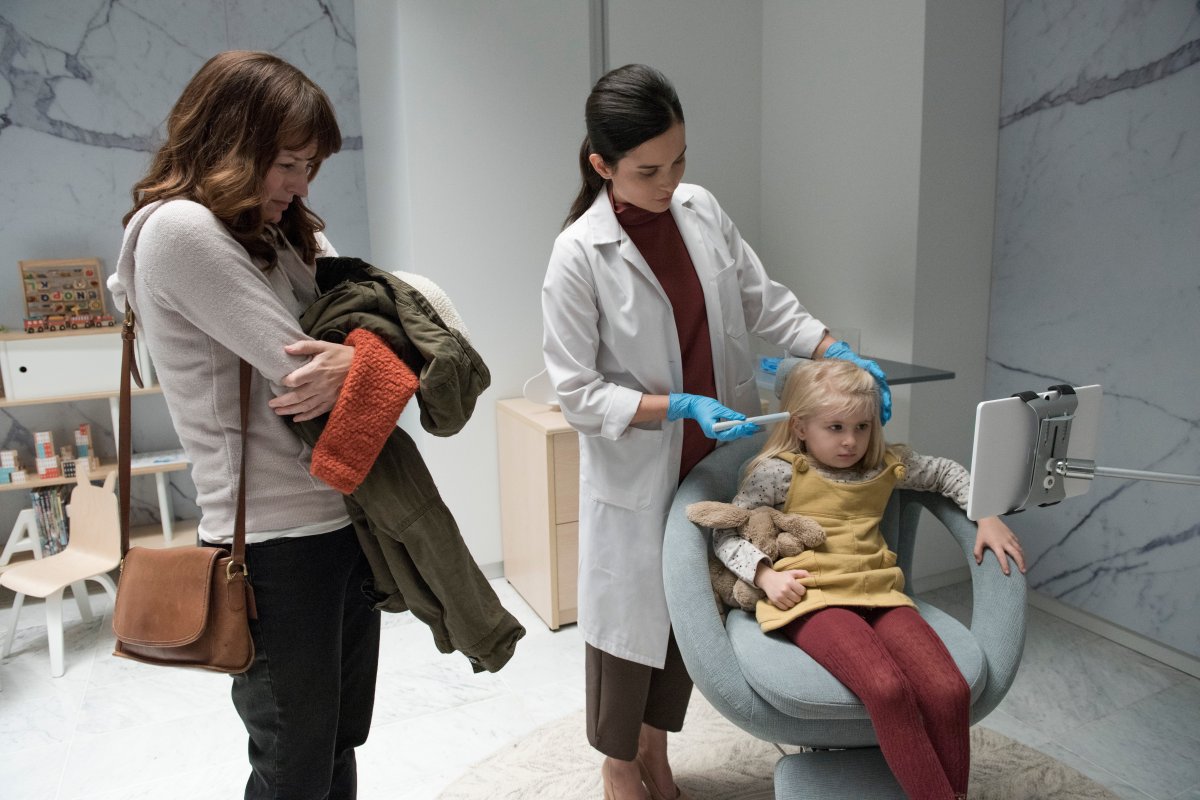 Then, every parent’s nightmare. Sarah wanders off from the playground, and her mother is gripped with panic. The neighbors find her a few hours later, but Sarah’s mother is shaken. She brings Sarah to Arkangel, a company that creates neural implants to set Sarah’s mom’s mind at ease. A technician places the implant into Sarah’s temple quickly and painlessly.