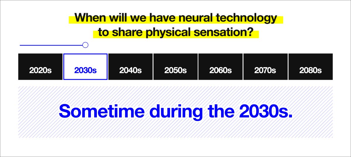 Even though the technology overall has a ways to go, it’s changing fast. And Stocco is optimistic that we could send physical sensations from one brain to the other pretty soon. “In twenty years, we have moved from crude pilots to having working limb prosthetics and cochlear implants, and as of now even a working memory prosthetic. My bet is that something close to a full neural interface that would let us feel what others feel could be reached by the end of 2038,” Stocco says.