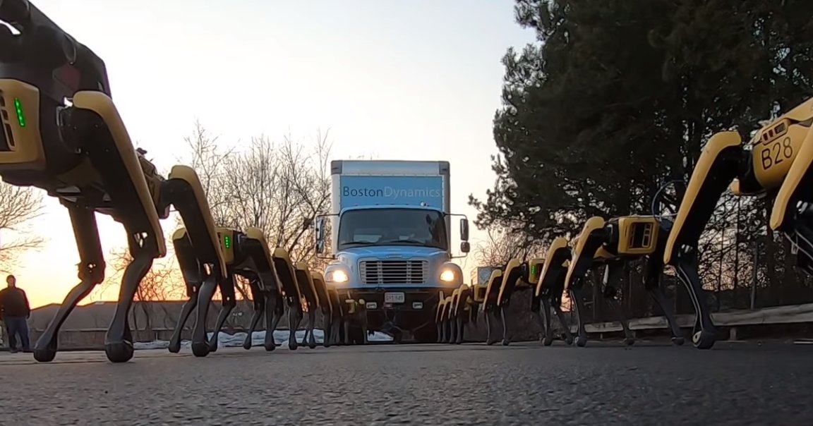 In an ominous video titled “Mush, Spot Mush!” posted on YouTube Tuesday, robot maker Boston Dynamics showed off the sheer strength of its SpotMini quadripedal robot dog. The clip shows 10 specialized Spotmini derivatives called Spotpower hauling a box truck across a parking lot — and at a one degree incline.