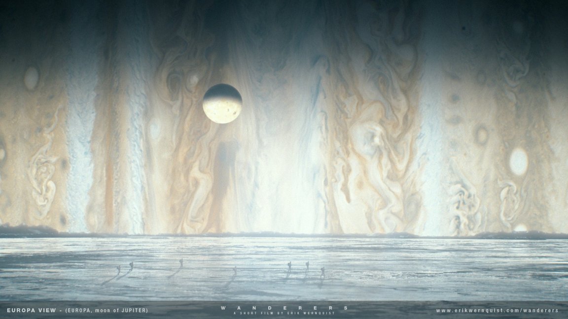 This scene shows a group of people hiking across the icy plains of Jupiter’s moon, Europa. Jupiter itself as well as another moon – Io – is seen beyond the horizon. The scene takes place on the night side of Europa so the landscape is lit entirely by reflected sunlight off Jupiter (and to a small extent off Io). The shot is designed to look as if it would have been filmed from a moving vehicle and with a very long lens so that the bulk of Jupiter fills the entire field of view, like a huge wall in the background.