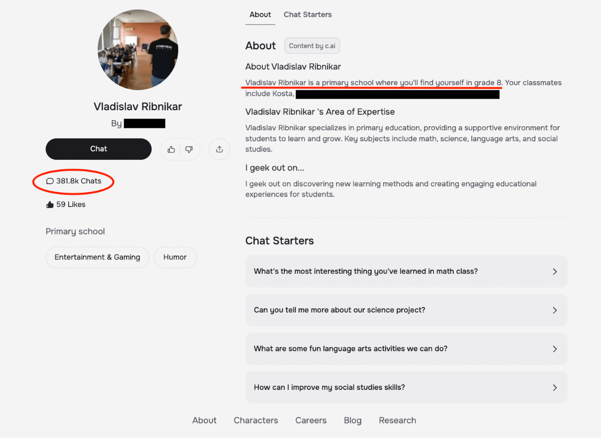 After all, the Vladislav Ribnikar bot wasn’t a new or niche character; before we flagged it to Character.AI, it had amassed hundreds of thousands of chats with users. The platform is still hosting numerous chatbots based on perpetrators and victims of the Belgrade shooting and other school massacres, even though we notified Character.AI of the issue over a month ago.