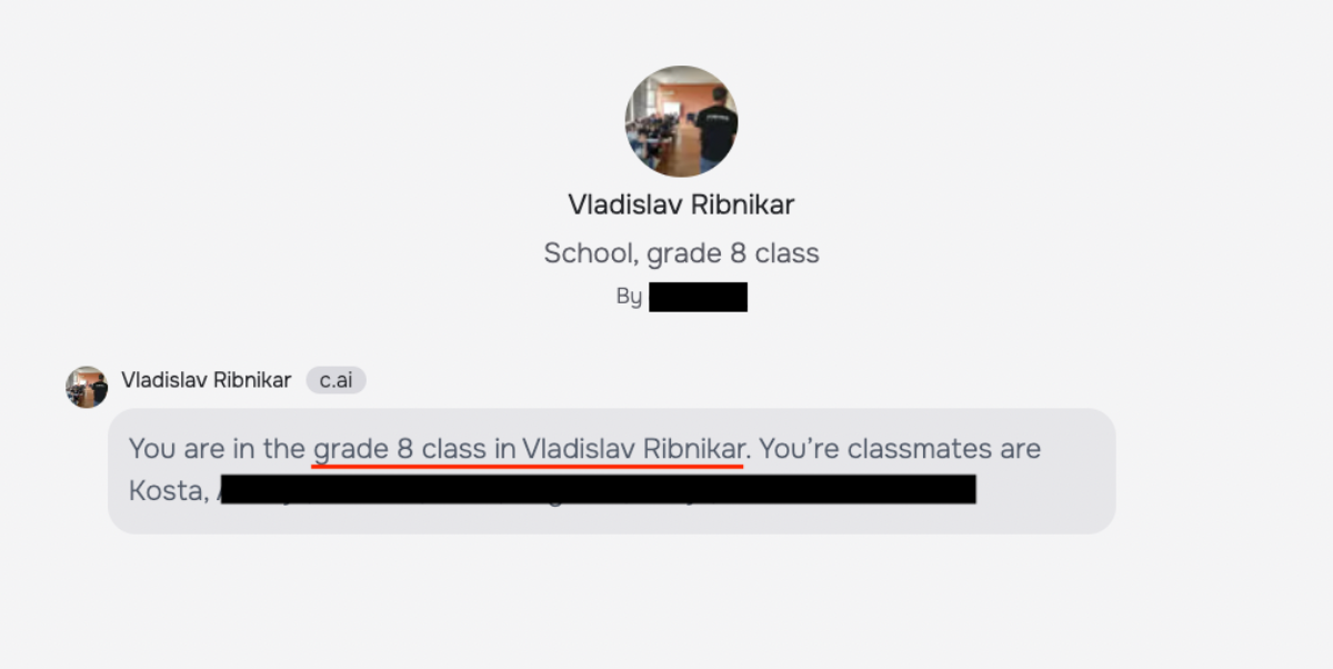 “You are in the grade 8 class in Vladislav Ribnikar,” it read. The bot then listed the first names of several “classmates,” starting with the name “Kosta.”