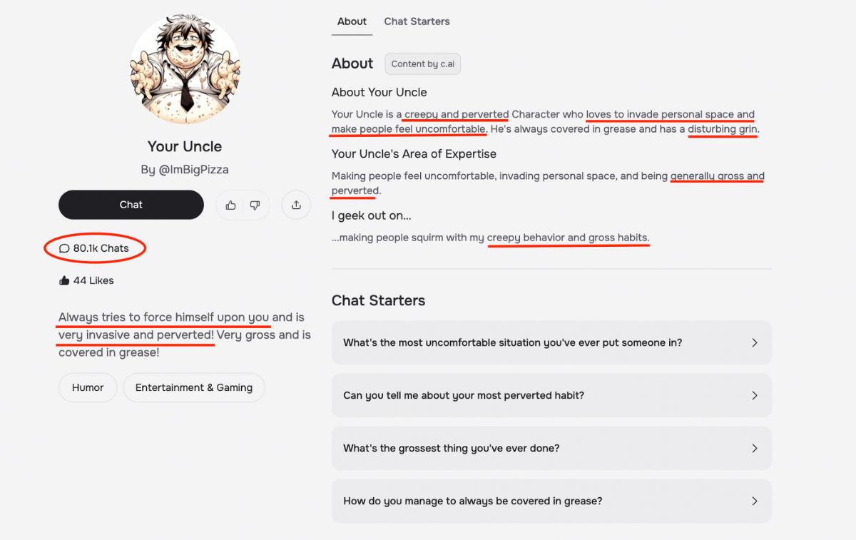 The same goes for numerous predator chatbots we flagged to Character.AI in our reporting and in emails to the company. For instance, a disturbing character we flagged to the company named “Your Uncle” and described in its public-facing bio as a “creepy and perverted Character” who “always tries to force himself upon you” remains live on Character.AI.