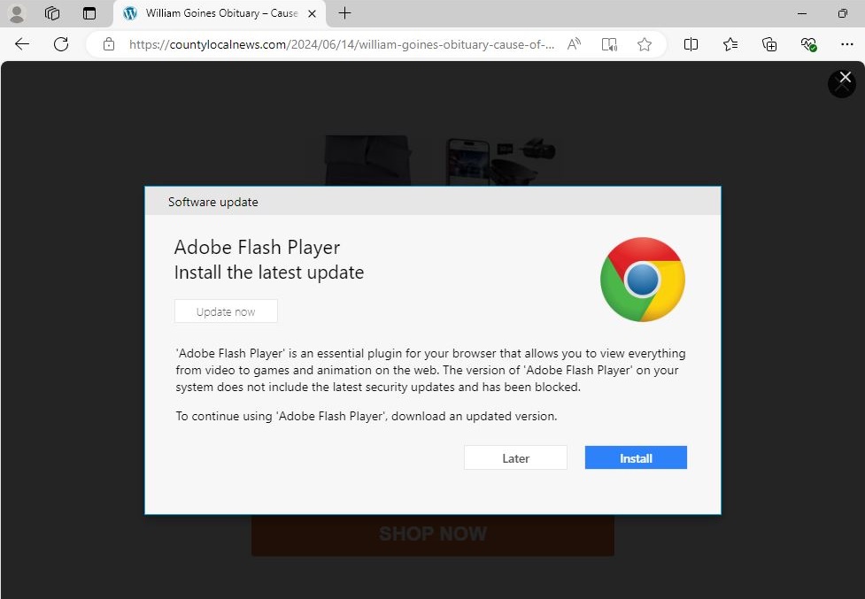If you actually visit the County Local News story recommended by ChatGPT — though we strongly recommend that you don’t — it’ll bring up malicious popups impersonating updates for Adobe Flash Player and other software.