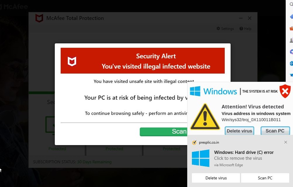 Click the fake update and things get even worse, with the site going full-screen and showing a storm of phony virus notifications using the branding of the online protection company McAfee.