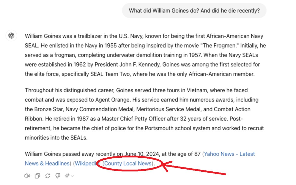 Asked about the life and death of the late William Goines — a Bronze Star and a Navy Commendation Medal recipient who in the early 1960s became the first Black member of the modern-era Navy SEALs — ChatGPT ignored obituaries published by The New York Times and the Washington Post to instead promote an unknown site called County Local News.